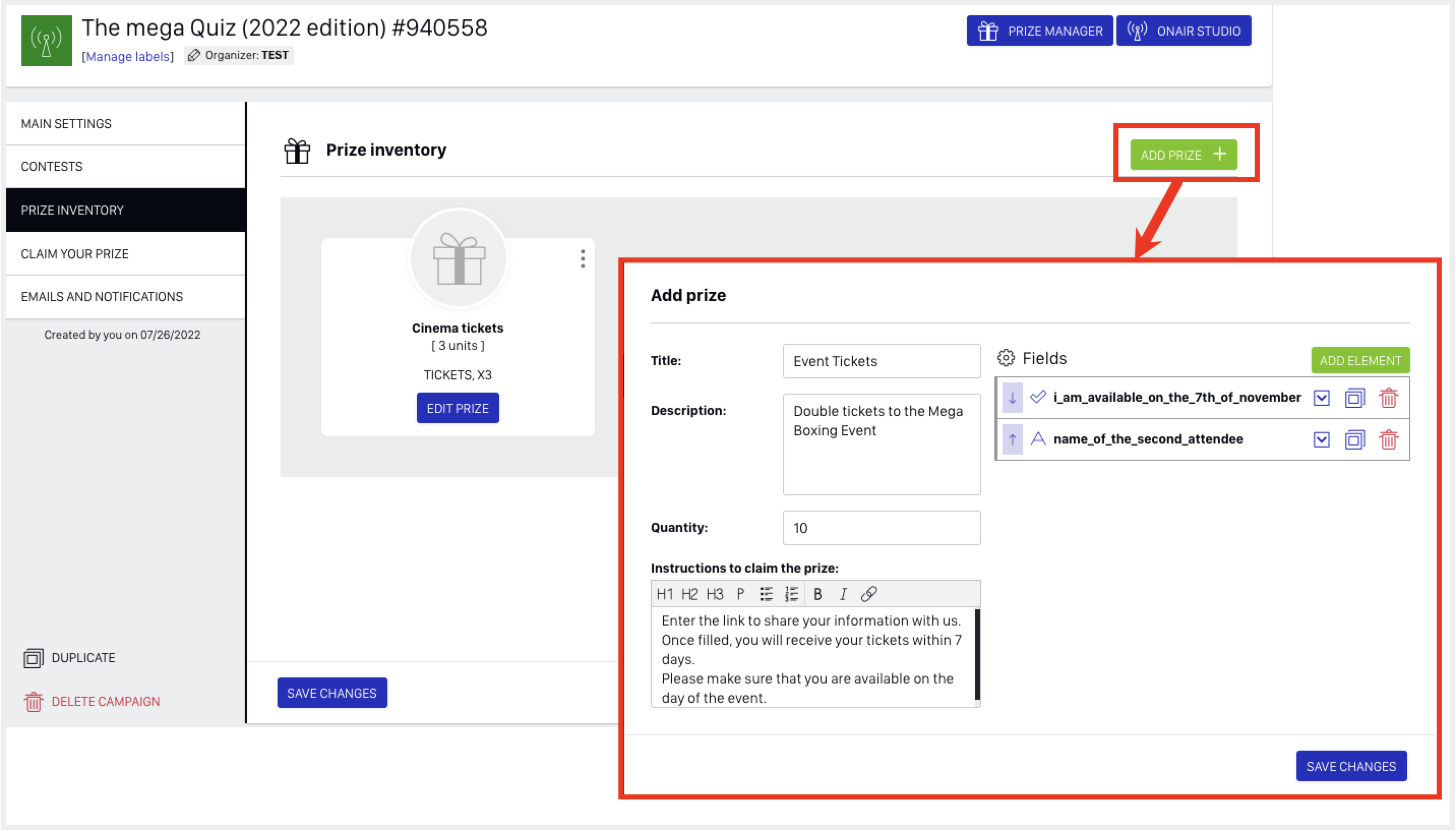Setup here the details of each of the prizes and, if relevant, can set up additional fields based on the prizes that you configure.