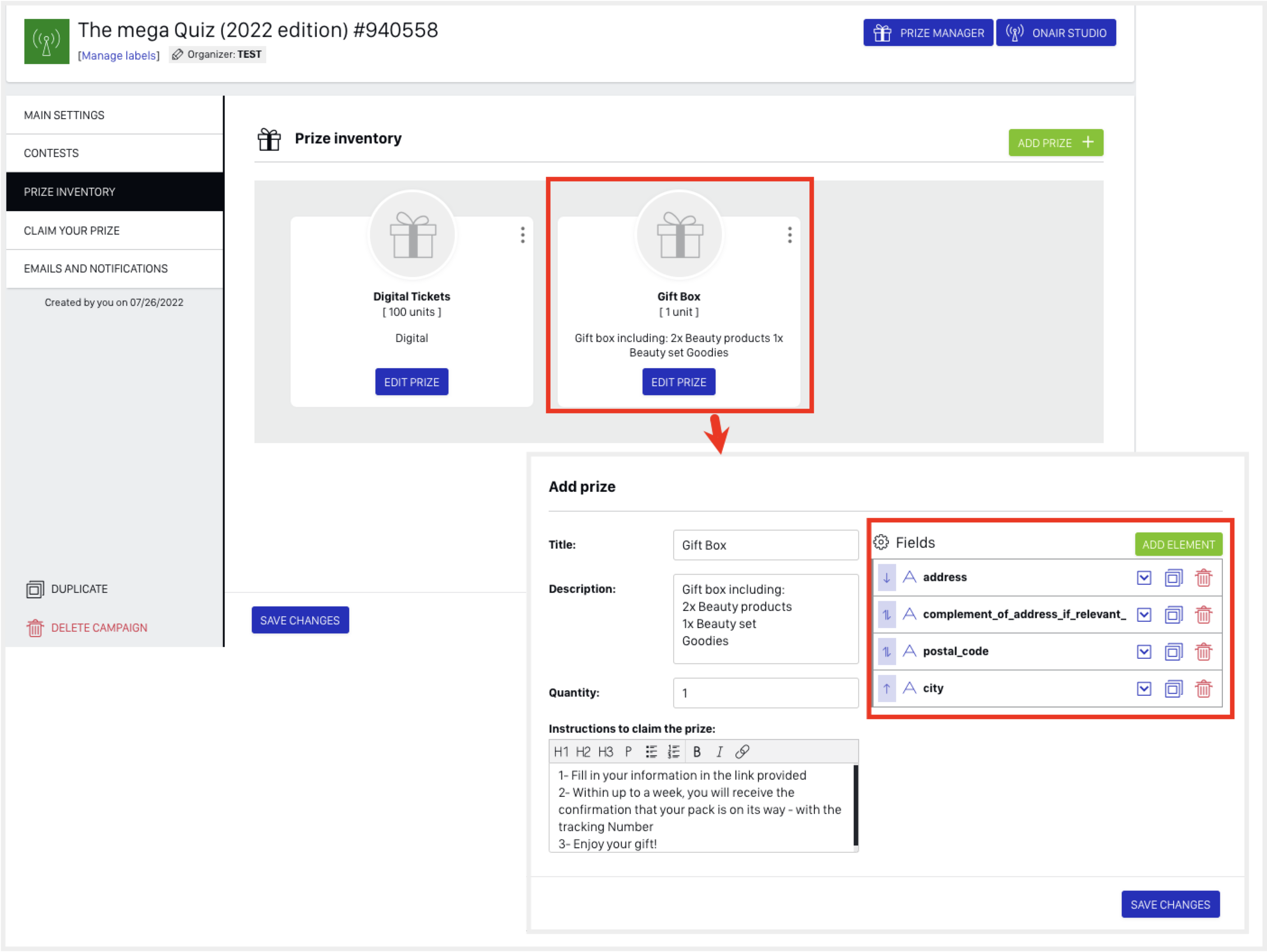 To gather all the information needed to send the prizes to the winners, the admins of the campaign can either send the claim your Prize URL to winners for them to fill in the form, or complete the information while on the phone with the candidate, from the OnAir Studio.