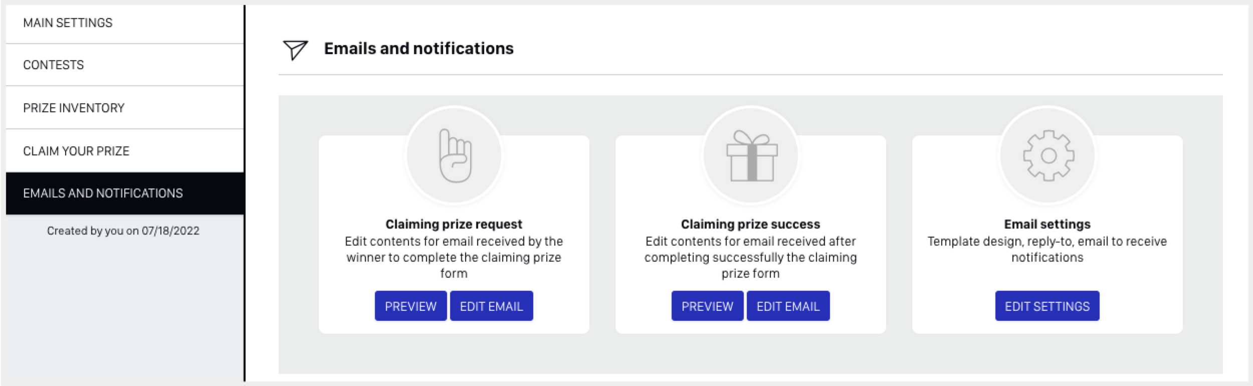 - In addition, you can customize the design of your emails entering the Settings feature. In the "Email notification" field you can specify the email address where you'll receive the confirmation that the prizes were claimed by users via the Claim form.