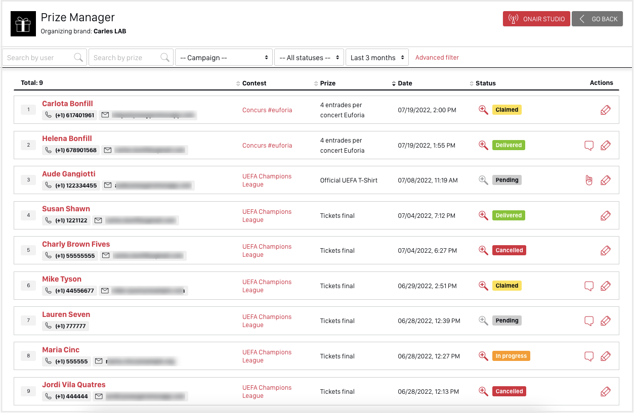 In addition, OnAir Campaigns include the prize manager system, which will allow you to keep track of the prizes that were assigned, make sure you have the required information from participants to send them the rewards and know at all times what is the status of the different prizes distributed.