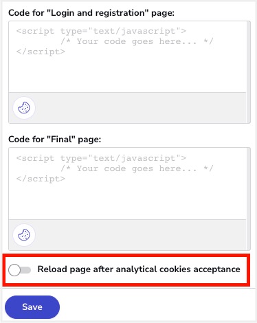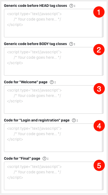 - Code for the “Login and Registration” page: paste the javascript code you want to add to the promotion's Login & Registration page.