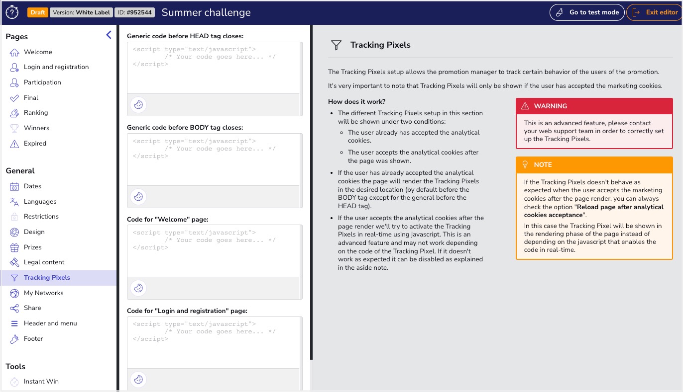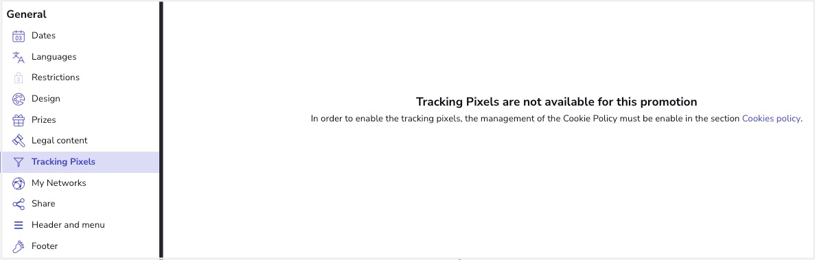 Once the management of the Cookies Policy in the promotion has been enabled, you can access the Editor > General > Tracking Pixels section, where you can paste the tracking pixels that you want to implement in the promotion.