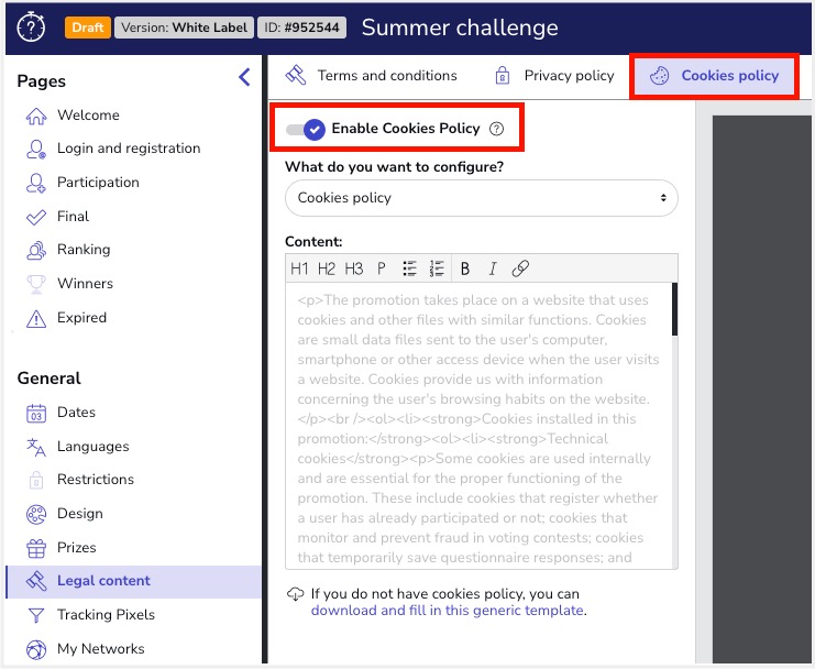 To activate the management of cookies in the promotion, access the Editor of the promotion > General > Legal texts > Cookies Policy section: