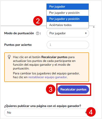 - Asignación automática de puntos a los acertantes del equipo final: Cuando el equipo titular se conozca podrás revisar automáticamente si hay participantes que hayan acertado la alineación. Puedes activar el ranking para hacer público la puntuación de todos los usuarios.