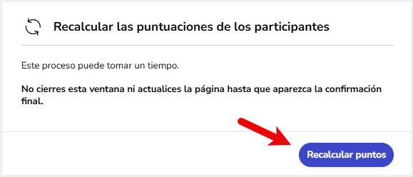 3. Finalmente, haz clic en el botón "Recalcular puntos" para actualizar las puntuaciones de los participantes. Una pantalla te mostrará cómo se está procediendo a recalcular y cuántos resultados de participantes se están actualizando.