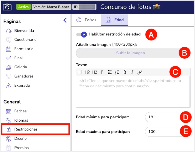 E. Edad máxima para participar: Indica aquí la edad máxima para participar en la promoción. La fecha que aquí indiques es la que el sistema tendrá en cuenta en el selector que le aparecerá al usuario en la ventana.
