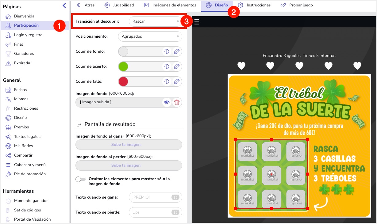 Para habilitar la opción de rascar para descubrir si se esconde algún premio debajo de los elementos, entra en el editor de la promoción > Participación, y en el "Descubre y Gana" > pestaña de Diseño, selecciona la transición al Descubrir: Rascar. Podrás seleccionar la o las zonas que el usuario deberá de rascar para descubrir si le toca algún premio.