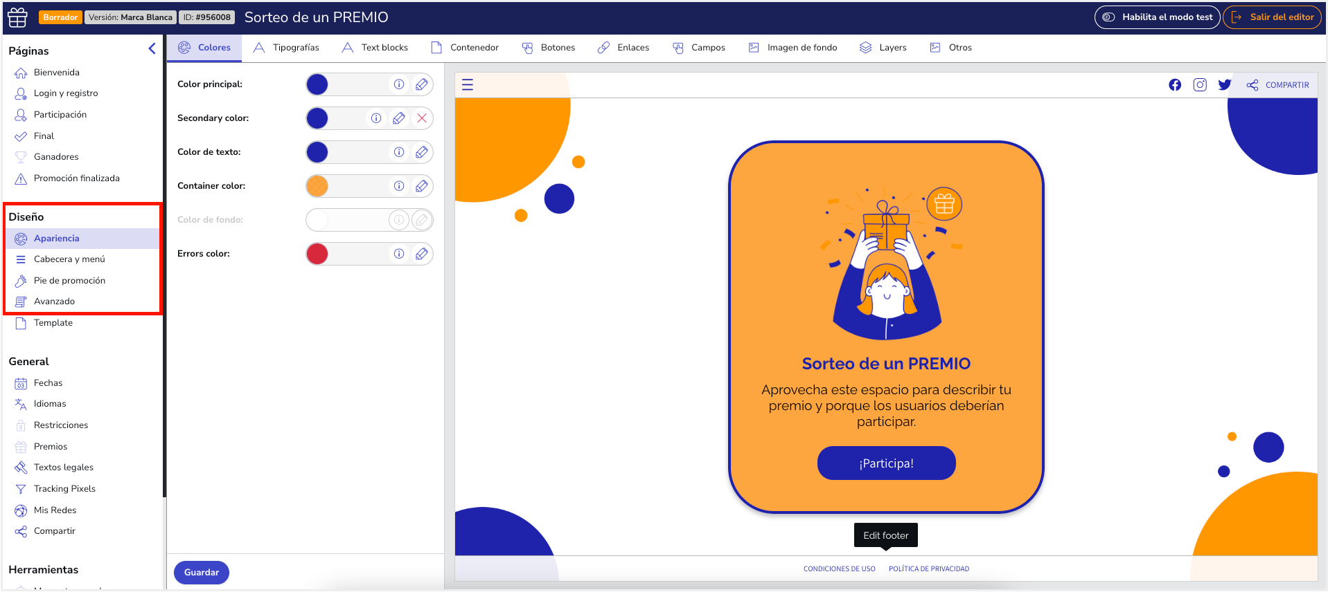 A continuación, dirígete al apartado Editor > Diseño. Aquí encontrarás las diferentes pestañas de edición que te permitirán personalizar los diferentes elementos del diseño de la promoción: