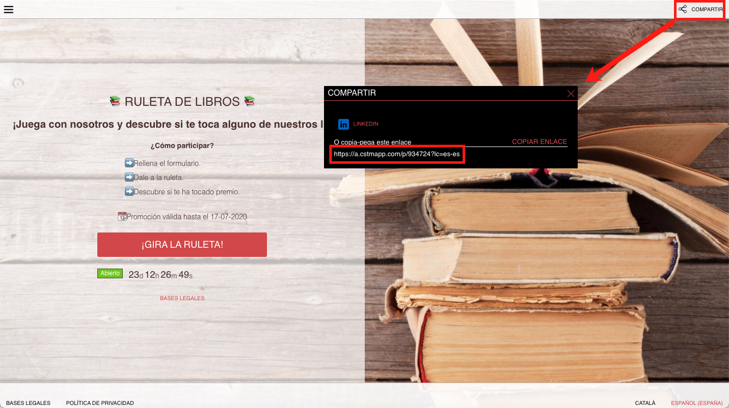En caso de utilizar la versión Marca Blanca y haber creado una promoción en varios idiomas, vacía la caché también del enlace de la promoción con el parámetro de idioma. Podrás encontrar los enlaces de la promoción con el parámetro de idioma en la página de gestión de la promoción, haciendo clic en "Compartir”: