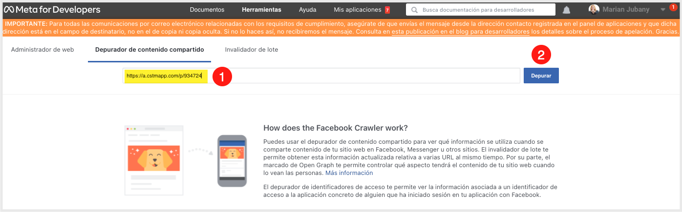 2. Accede a la herramienta de vaciar la caché que proporciona Facebook a través del siguiente enlace: http://developers.facebook.com/tools/debug