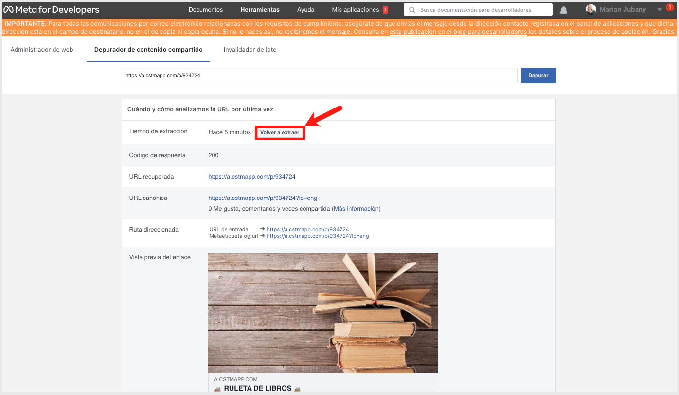 4. A continuación, Facebook mostrará el contenido que tiene en caché para ese enlace. Para vaciar la caché haz clic en el botón “Volver a extraer”, lo que forzará a Facebook a volver a leer el contenido del enlace: