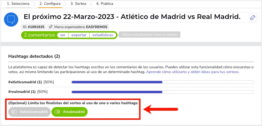 Nota: Debes seleccionar todos los hashtags que quieras que entren en el sorteo. Si no seleccionas ninguno, entran todos los comentarios, aunque no hayan utilizado hashtag.