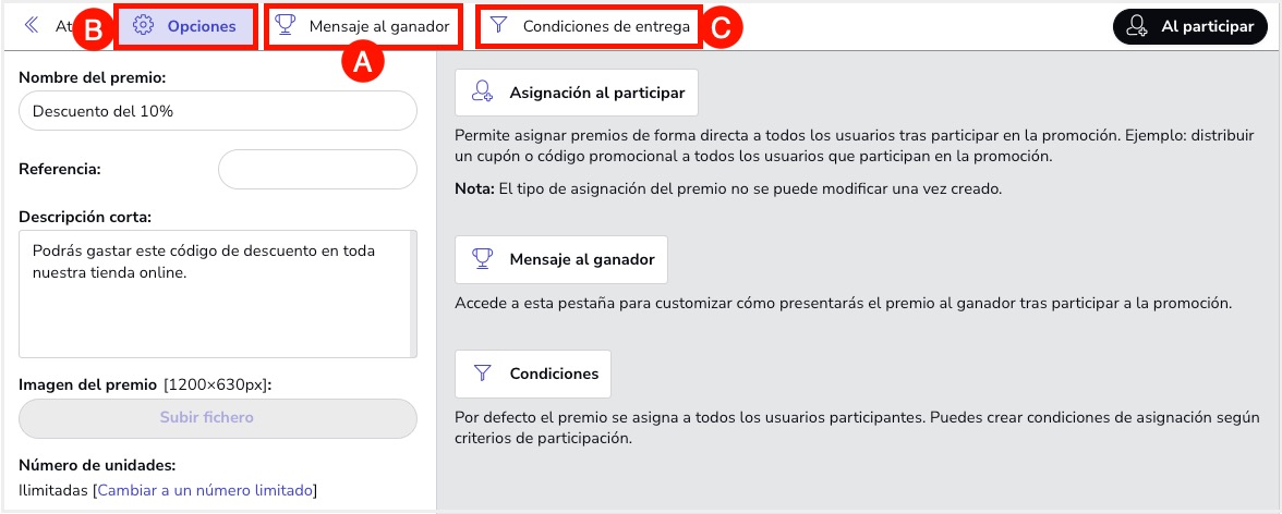 B. Pestaña “Opciones”: En esta pestaña encontrarás todas las opciones para configurar las propiedades del premio: