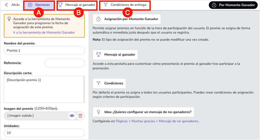 - Botón “Añadir Momento Ganador”: Te permitirá crear los “momentos ganadores” para cada tipo de premio que has creado.