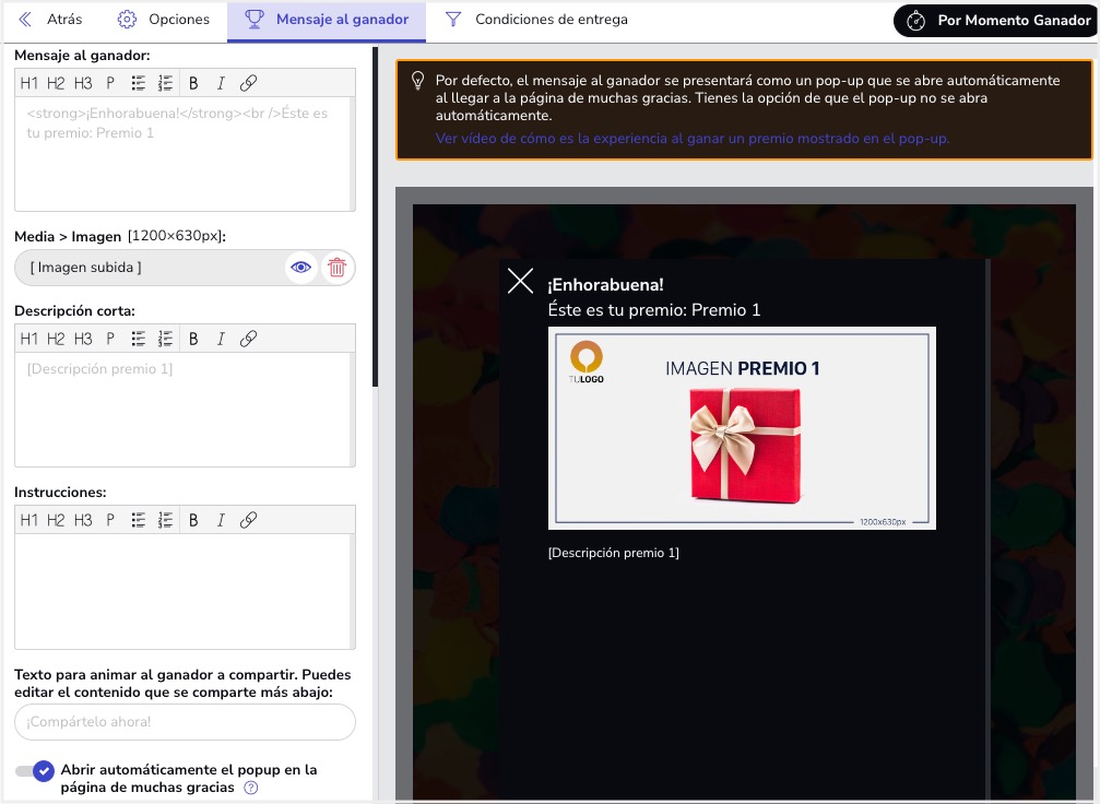 B. Pestaña "Mensaje al ganador": Esta pestaña presenta todas las opciones para personalizar el diseño y la forma de presentar el mensaje a los usuarios que resulten ganadores del premio. En concreto, podrás subir una imagen y configurar el mensaje que verán los ganadores.