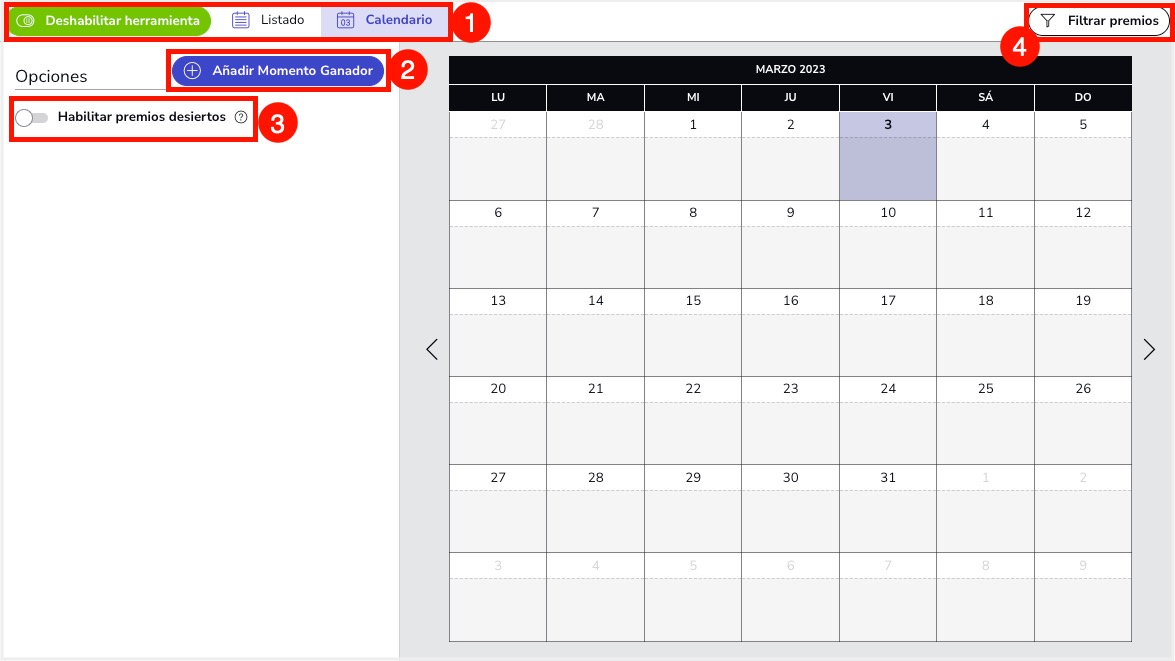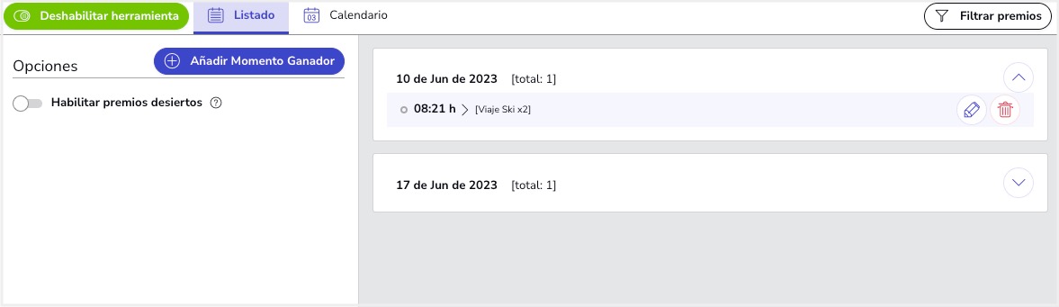 - Pestaña Calendario / Lista: Permite visualizar el listado de momentos ganadores, bien en formato calendario (por defecto) o bien en formato lista.