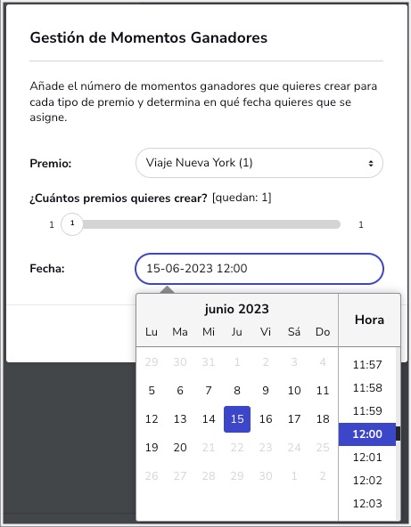 - Fecha y hora: Determina el periodo durante el cual quieres que se asignen los momentos ganadores y el sistema se encargará de programarlos de forma aleatoria entre el periodo indicado.