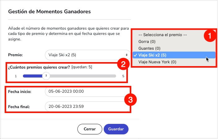 - Selecciona la cantidad de momentos ganadores que quieres crear para ese tipo de premio. Puedes programar todos los momentos ganadores de golpe o empezar por alguno primero, por ejemplo, por si quieres hacer una prueba.