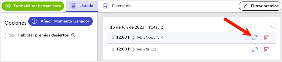 Una vez programados todos los momentos ganadores de los diferentes premios de la promoción, podrás consultar la distribución para comprobar en qué fecha se repartirán a lo largo de la promoción. Una vez programados, tienes la posibilidad de cambiar la fecha de asignación de alguno de los premios, por ejemplo, si observas que hay muchos premios para asignar concentrados en una misma fecha. Para ello, para cada momento ganador tienes disponible las opciones de “editar” y “eliminar”: