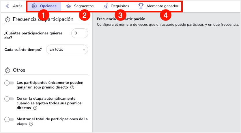 1. Opciones: Desde este apartado, podrás configurar el número de veces que los usuarios podrán probar suerte en el Momento Ganador, así como la frecuencia de participación que se otorga a los usuarios. Además, también podrás marcar la casilla "En caso que des premios directos al participar, los participantes sólo pueden ganar un premio", que permitirá configurar que un mismo participante solamente pueda ganar 1 premio.