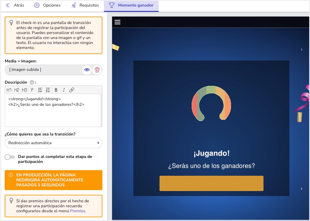4. Momento ganador. En esta pestaña podrás configurar la pantalla que le aparecerá al usuario tras rellenar el formulario de registro y justo antes de descubrir si ha resultado ganador de un premio o no. Esta pantalla se concreta con un botón de "Continuar" para acceder al resultado de la asignación del premio o bien también puede configurarse como una barra de progreso que redirecciona al usuario automáticamente pasados 3 segundos.