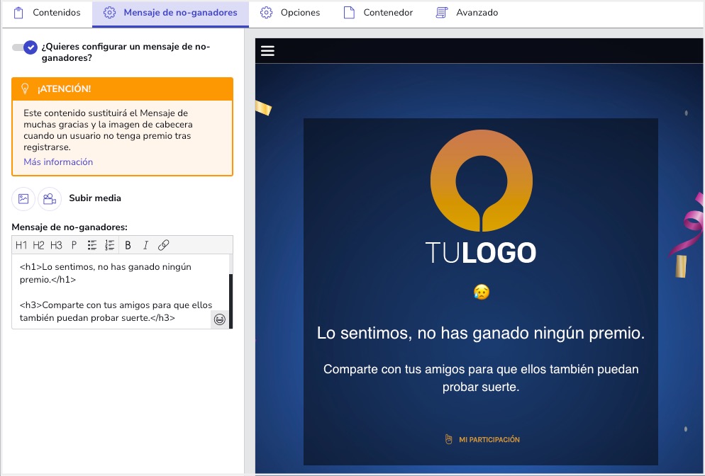 3. A continuación, podrás personalizar el mensaje para no-ganadores con las siguientes opciones: