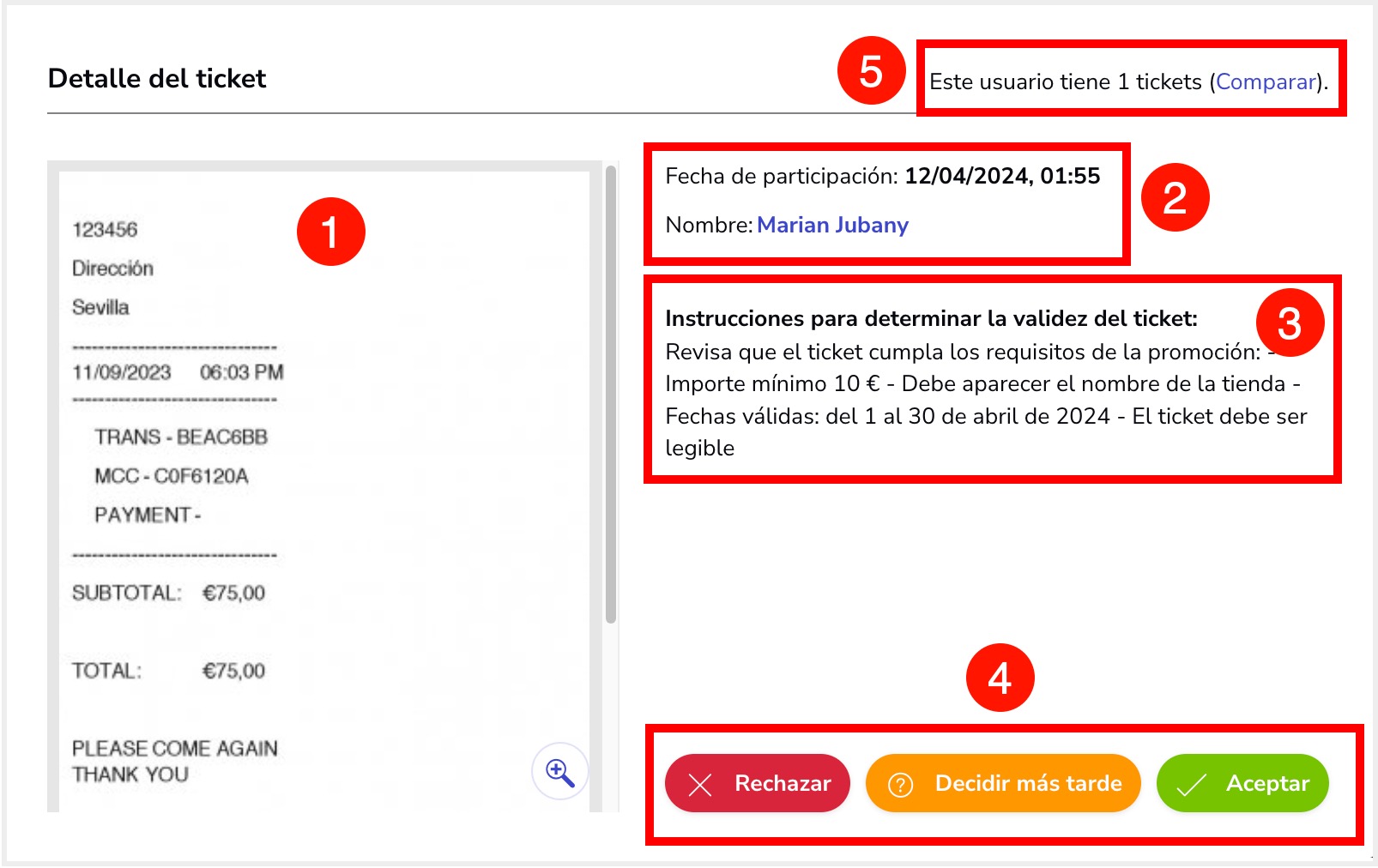 De esta forma, desde el gestor de usuarios de la promoción el administrador podrá consultar en todo momento las fotos de los tickets subidos por los participantes. Adicionalmente, también podrá habilitar la herramienta de pre-moderación, de forma que los tickets quedan pendientes para ser revisados y validados manualmente por parte de un moderador.