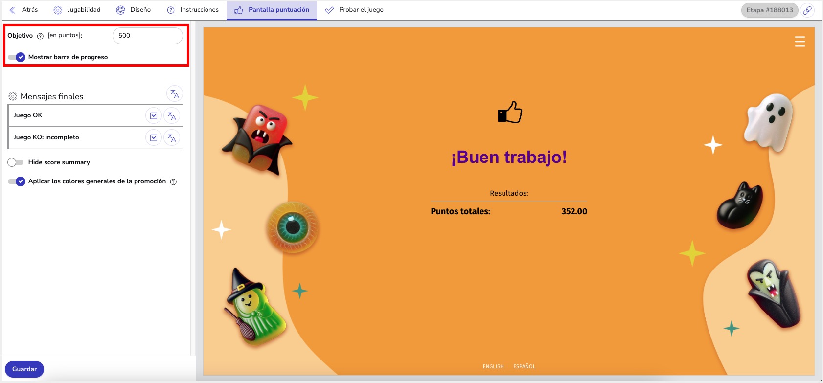 Para configurar esta opción, se deberá definir la puntuación a conseguir para alcanzar el objetivo a través de la siguiente opción: