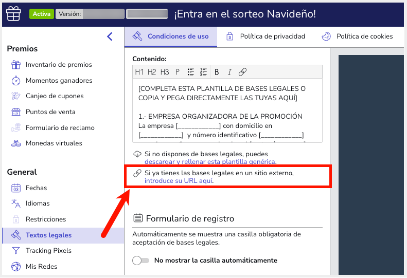 A continuación, te aparecerá el campo de texto donde podrás introducir la URL externa donde tienes alojadas las Condiciones de Uso de la promoción/marca: