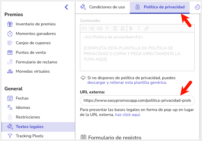 2018-06-22 - Poder introducir las Bases legales y la Política de privacidad por URL externa Seguir