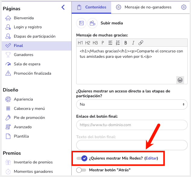 Para habilitar el módulo "Mis Redes" en la página Final de la promoción, deberás seguir estos pasos:
