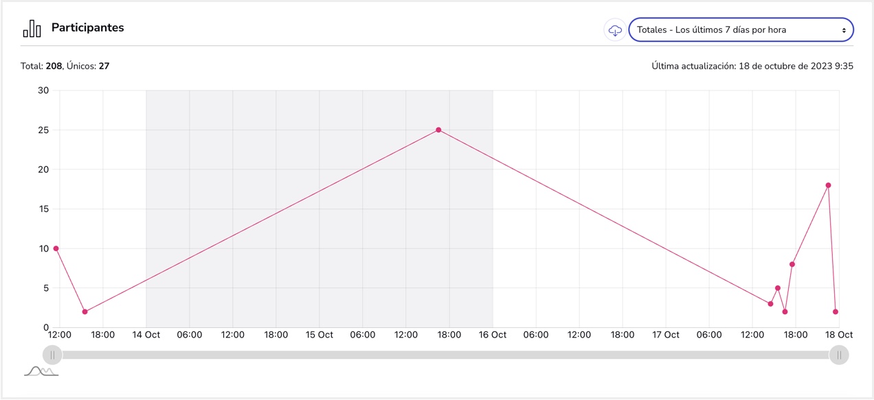 Las estadísticas se podrán descargar en diferentes formatos e igual que los gráficos. Para ellos deberás de hacer click el botón de descargar, situado en la parte superior derecha de cada gráfico.