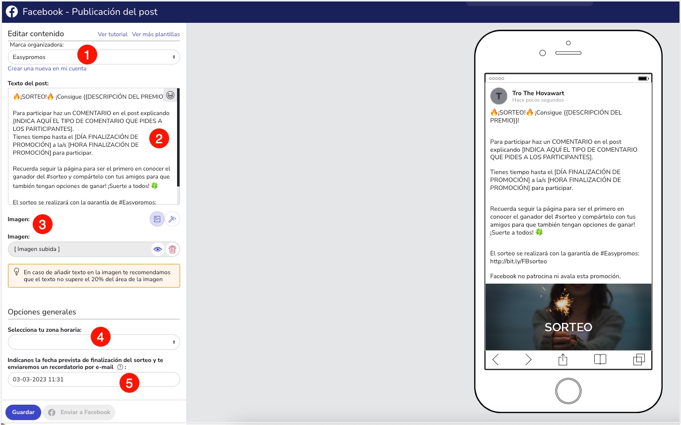 - Editar el texto de la publicación para adaptarlo a tu propio sorteo. Verás que el texto presenta palabras en [] , que son las palabras que deberás modificar para adaptarlas a tu sorteo, como por ejemplo, descripción del premio, instrucciones de participación, fecha límite para participar, etc. Aprovecha para añadir el enlace de las bases legales al final del texto, para así permitir a los usuarios poder consultar las bases en cualquier momento.