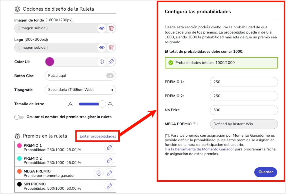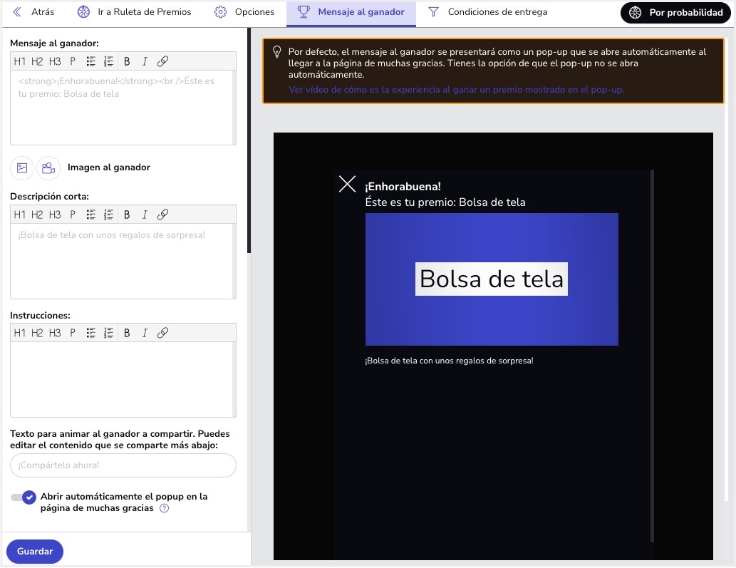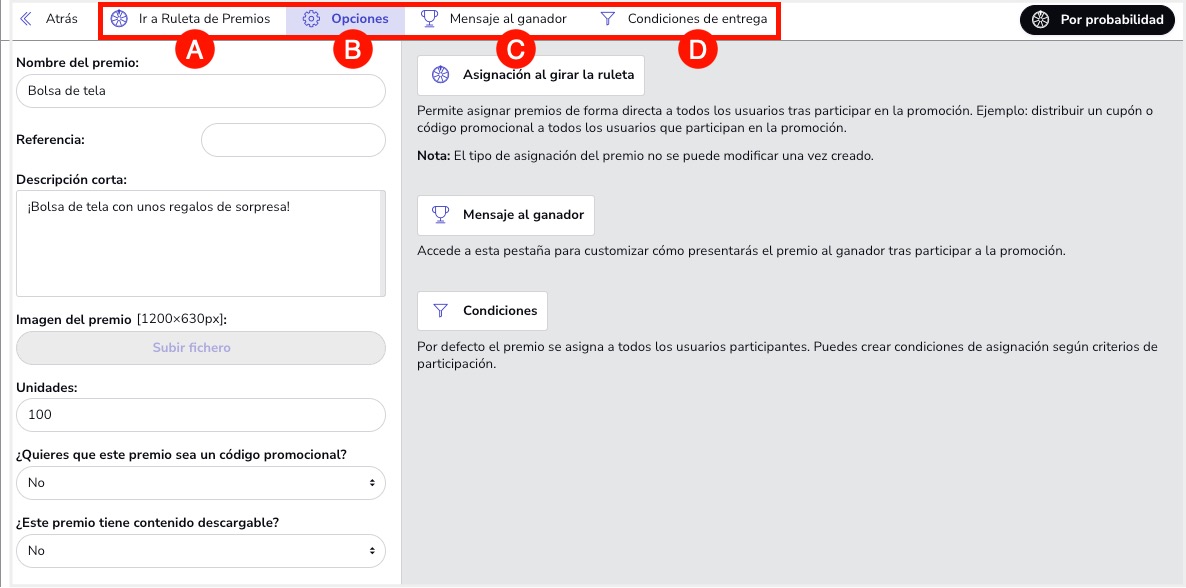 Desde el apartado Editor > General > Premios podrás crear los premios por Probabilidad: