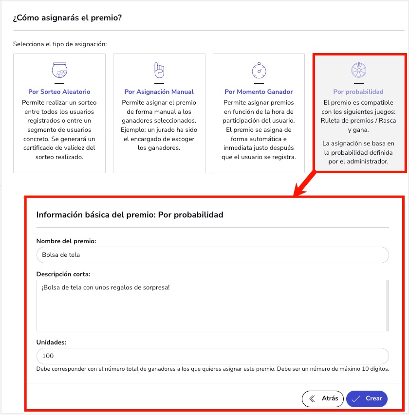 - Premios del tipo “Probabilidad”: Estos son premios que se asignan en función de las probabilidades definidas por el organizador.
