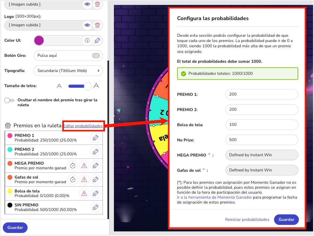 Una vez creado el premio, desde el apartado Editor > Páginas > Participación > Ruleta de premios podrás definir las probabilidades de que toque cada uno de los premios de la Ruleta: