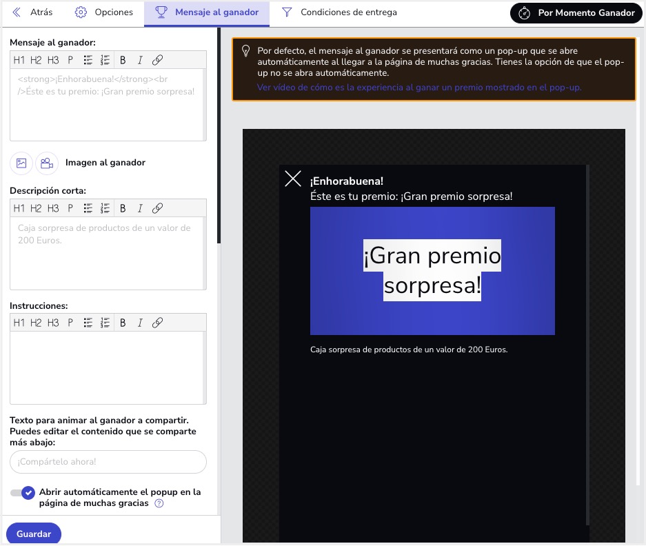 Desde el apartado Editor > General > Premios podrás crear los premios por Momento ganador: