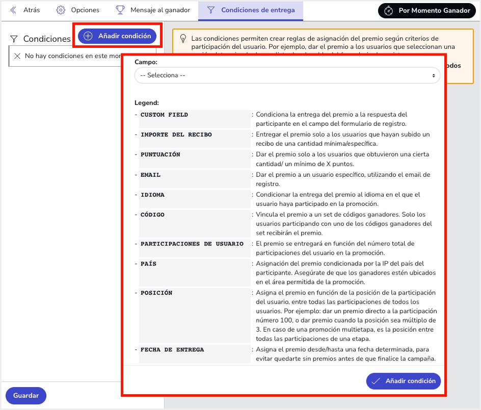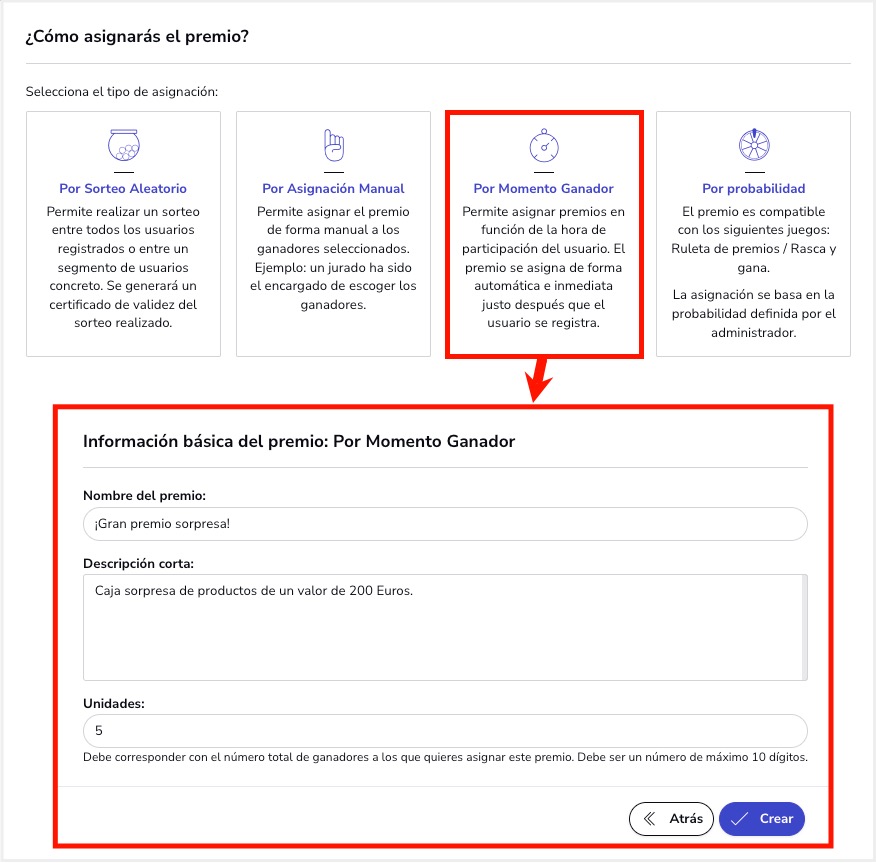 - Premios del tipo “Momento ganador”: Estos son premios que se asignan en función a una fecha y hora definida por el organizador.