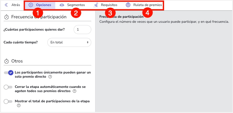 2. Opciones: Contiene las opciones generales de la etapa. Desde este apartado, podrás configurar el número de veces que los usuarios podrán jugar a la Ruleta, así como la frecuencia de participación que se otorga a los usuarios.