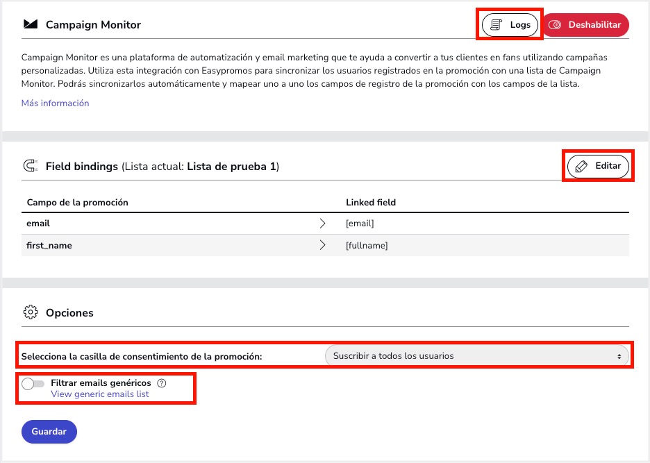Nota: La integración con Campaign Monitor únicamente está disponible para clientes con Plan Corporate o Plan Marca Blanca.