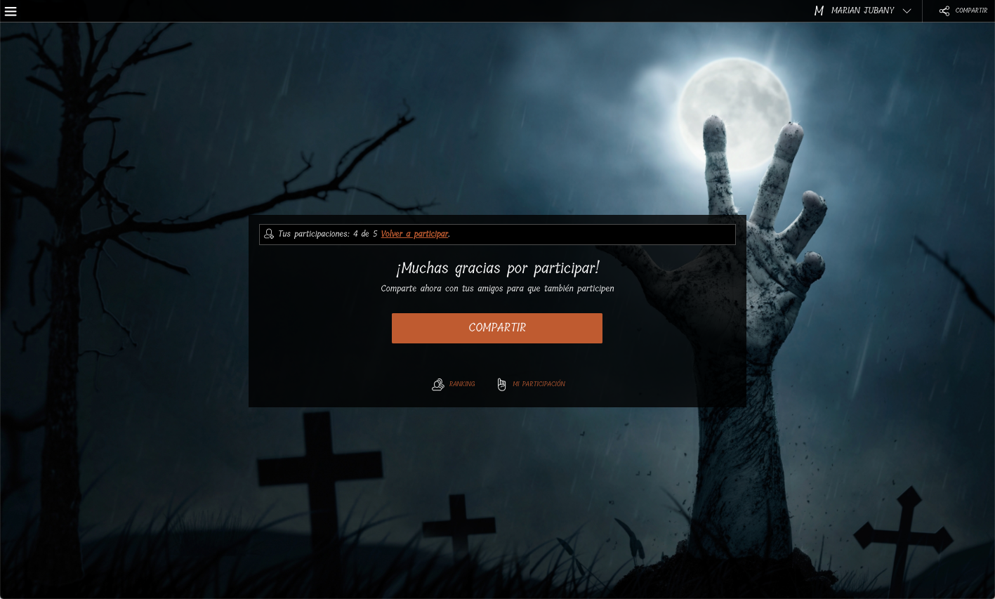 Ésta es la página a la que accede un usuario tras completar una etapa de participación. Aprovecha esta pantalla para mostrar un mensaje agradeciendo al usuario su participación y para que comparta con sus amigos.