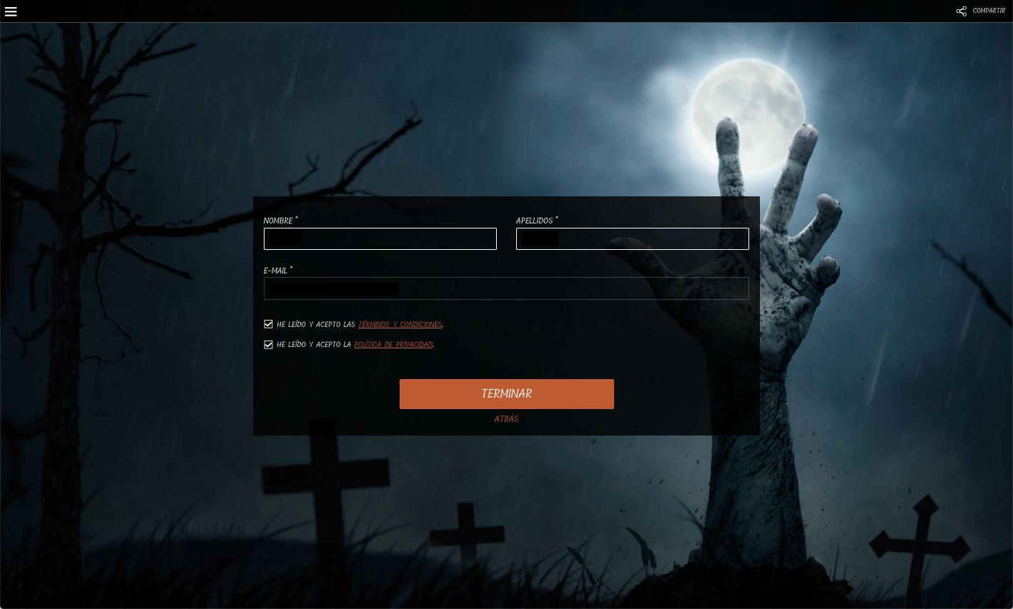 Si es la primera vez que el usuario participa, el siguiente paso será completar el formulario de registro y aceptar las bases legales y la política de privacidad. Al completar el registro, automáticamente se genera la sesión del participante para poder participar. Podrás personalizar todos los campos del formulario.