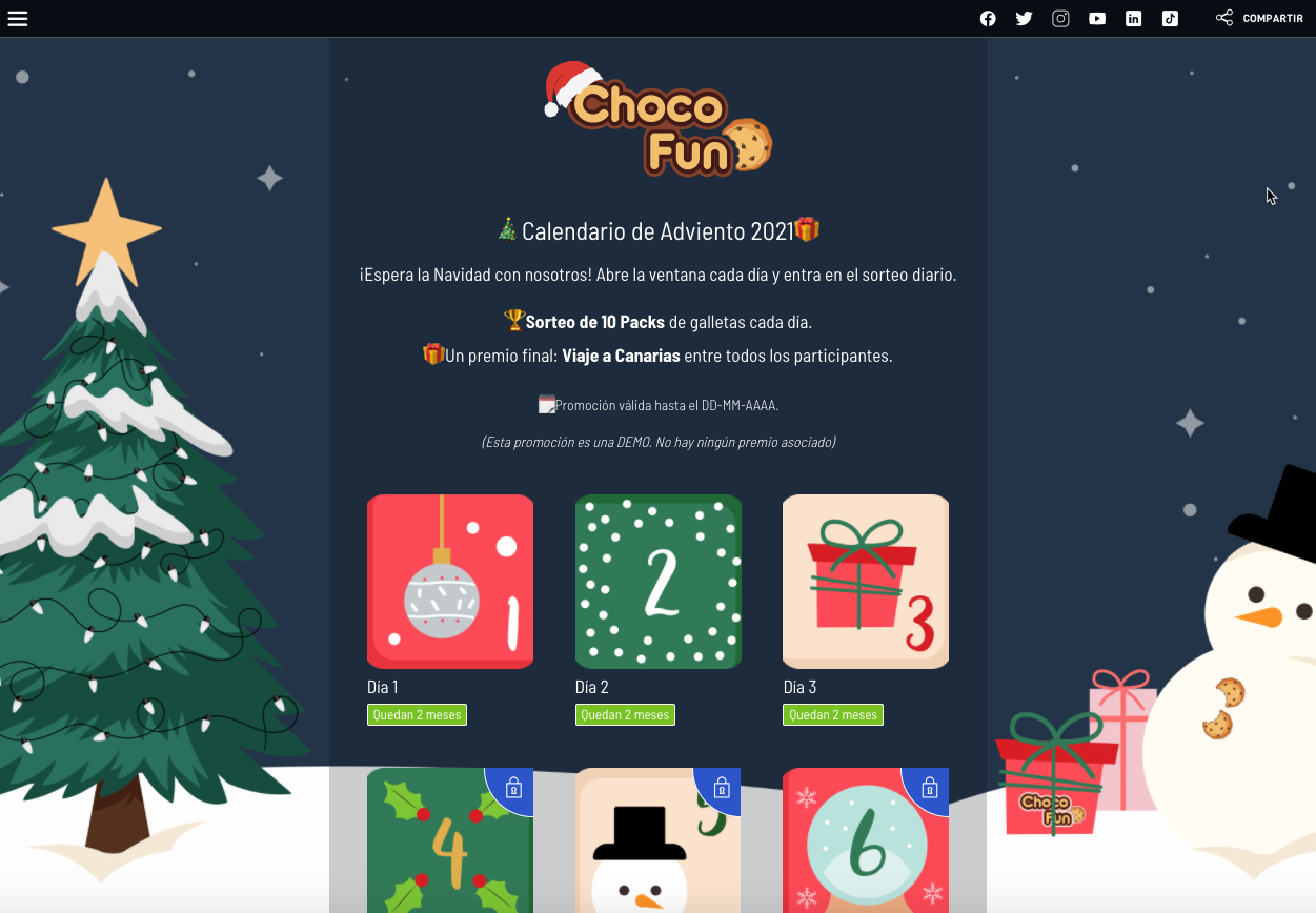 - El tradicional Calendario de Adviento digital en el que cada día un usuario abre una ventana, y se encuentra un contenido o una mecánica promocional diferente. Cada ventana corresponde a una etapa de participación en la promoción.