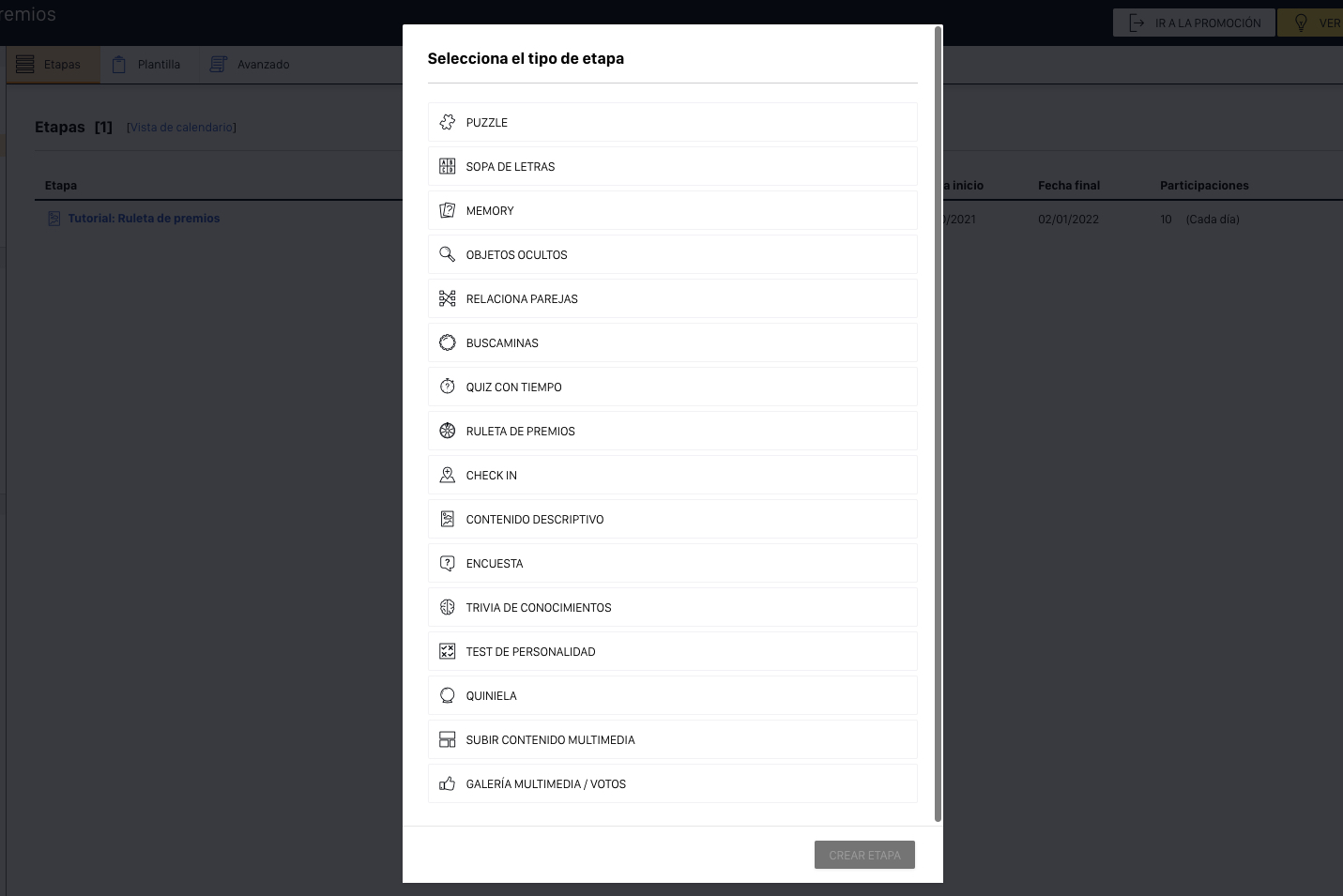 A continuación pasamos a describir cómo crear y gestionar las diferentes etapas de participación que queremos incluir en la promoción.