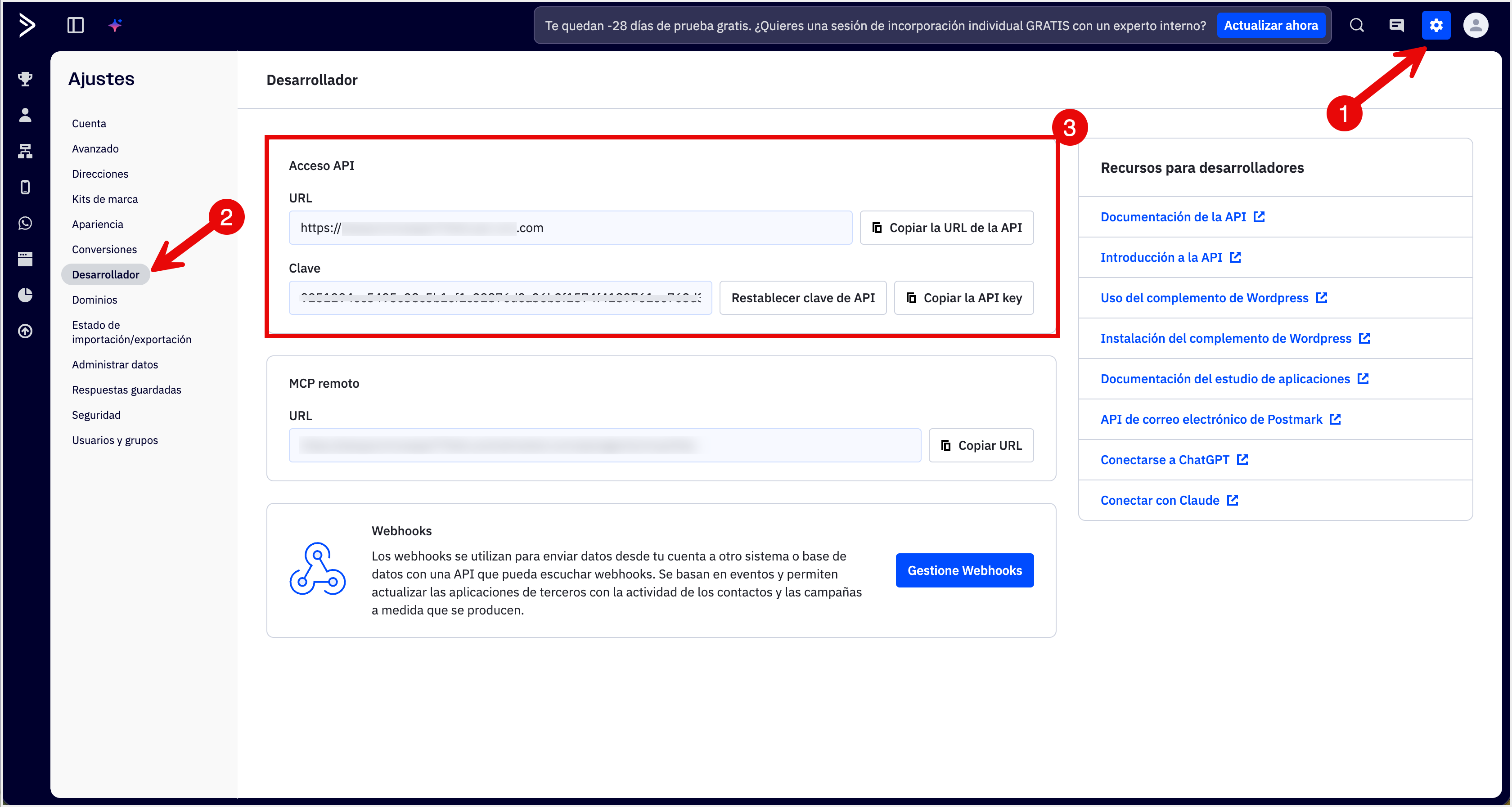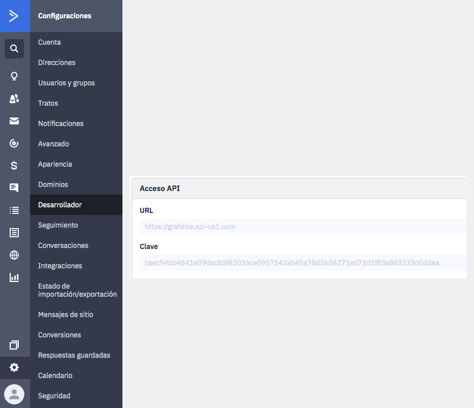 Para ello, deberás acceder a tu cuenta de ActiveCampaign, ir al apartado Ajustes > Desarrollador y crear una nueva API (o utilizar una existente). En esta pantalla podrás copiar la URL de acceso a la API y la Clave de acceso a la API, que se utilizarán más adelante.