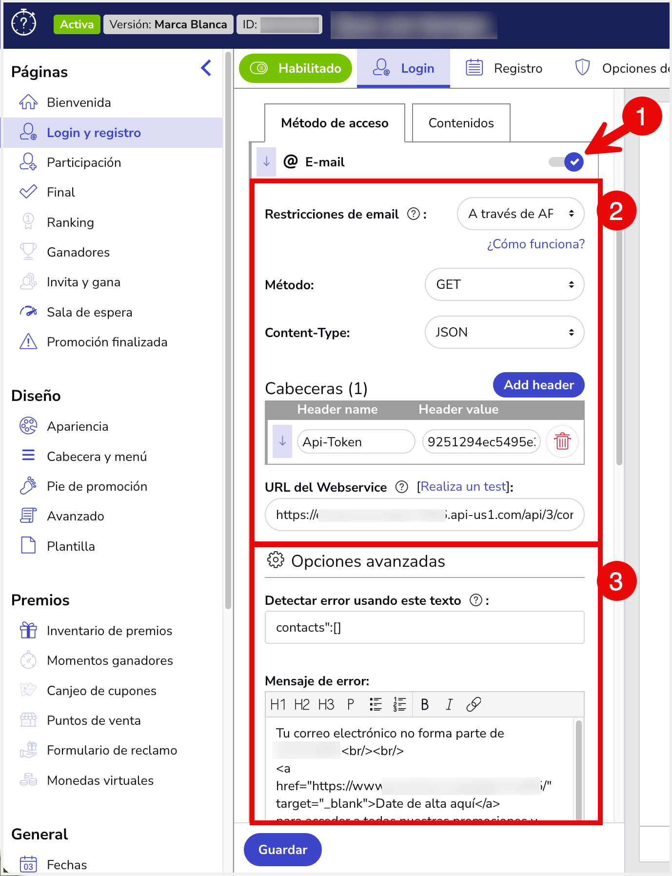 2. Activa la opción Restricciones por email y selecciona A través de API externa (webservice).