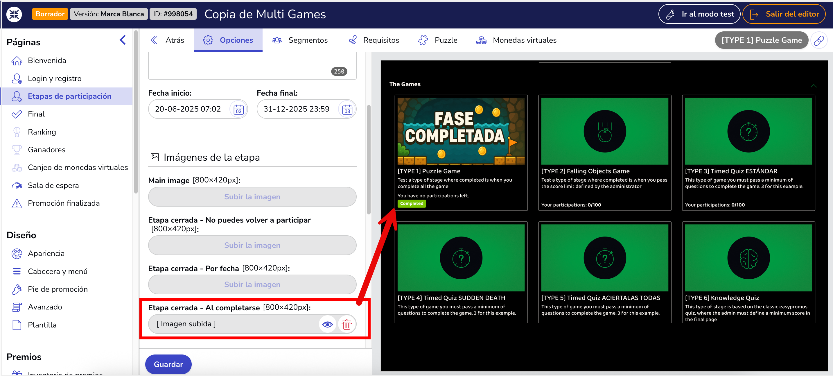 El administrador puede subir una imagen de "Etapa completada", que se mostrará en la página de listado de etapas en caso que el usuario haya completado el juego.