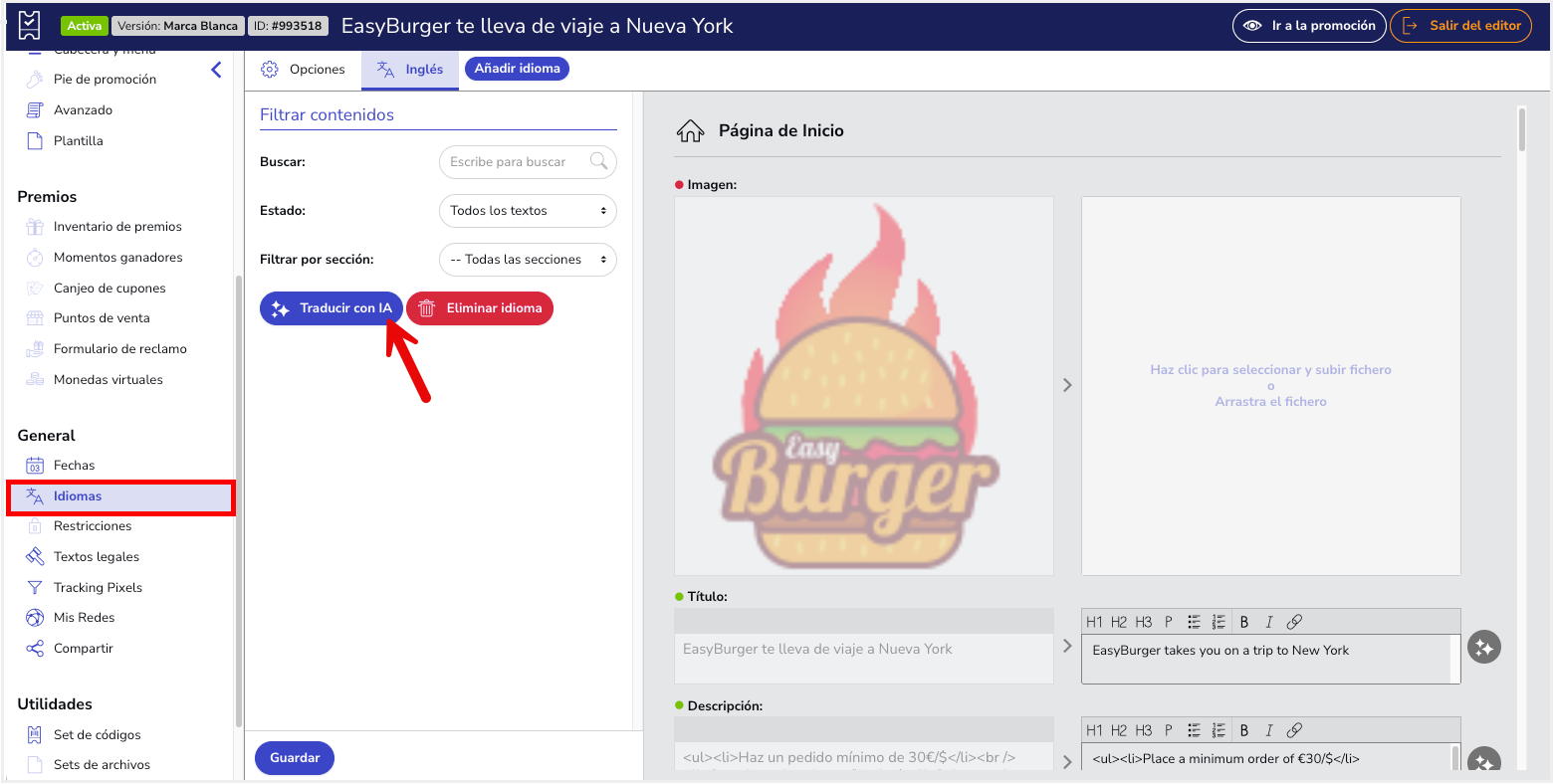 Nota: La funcionalidad de traducción automática mediante IA está disponible únicamente en promociones multiidioma, una opción incluida en la versión Marca Blanca de la plataforma.