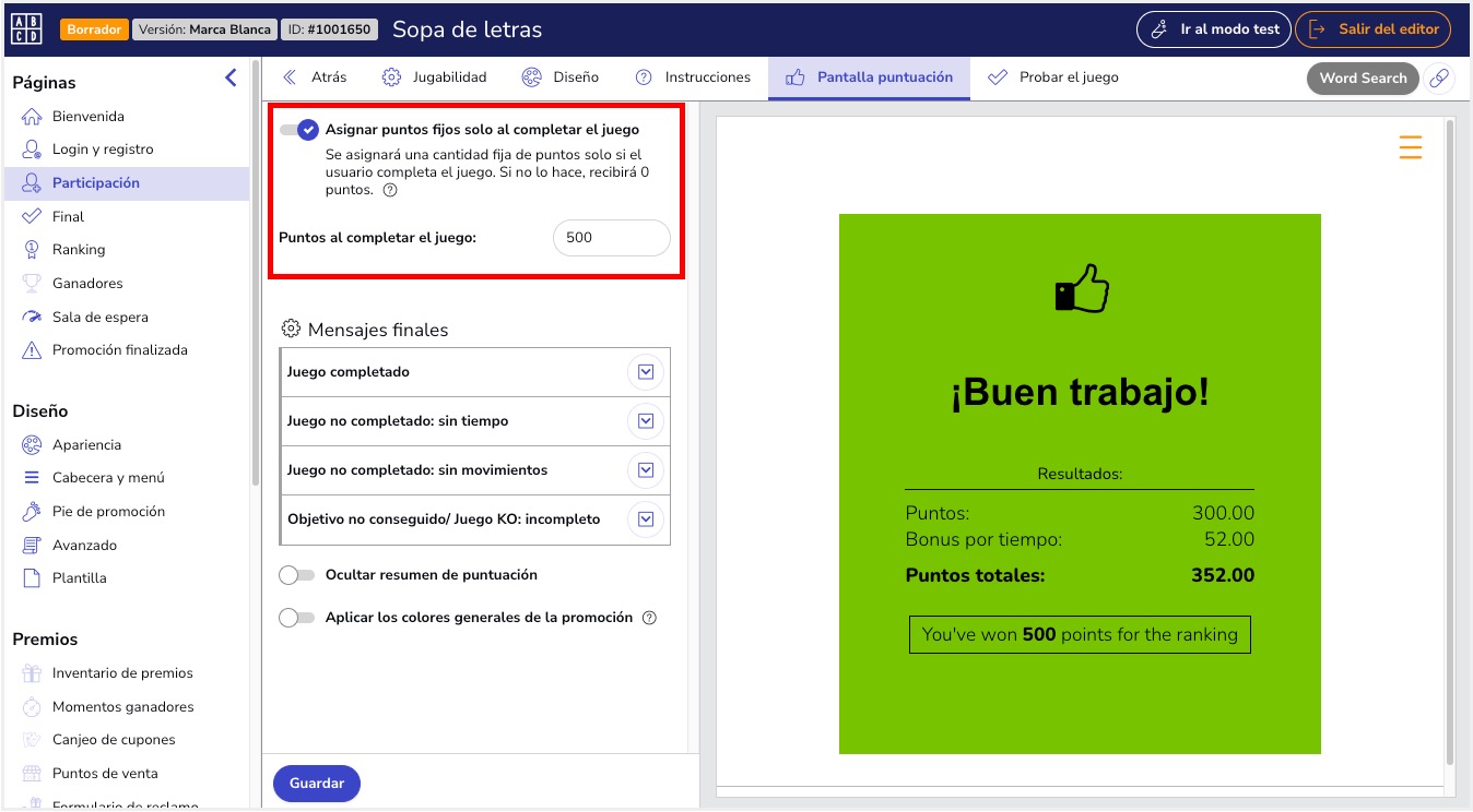 Hemos incorporado una nueva configuración que permite asignar una puntuación fija solo si el usuario completa el juego dentro del tiempo establecido.