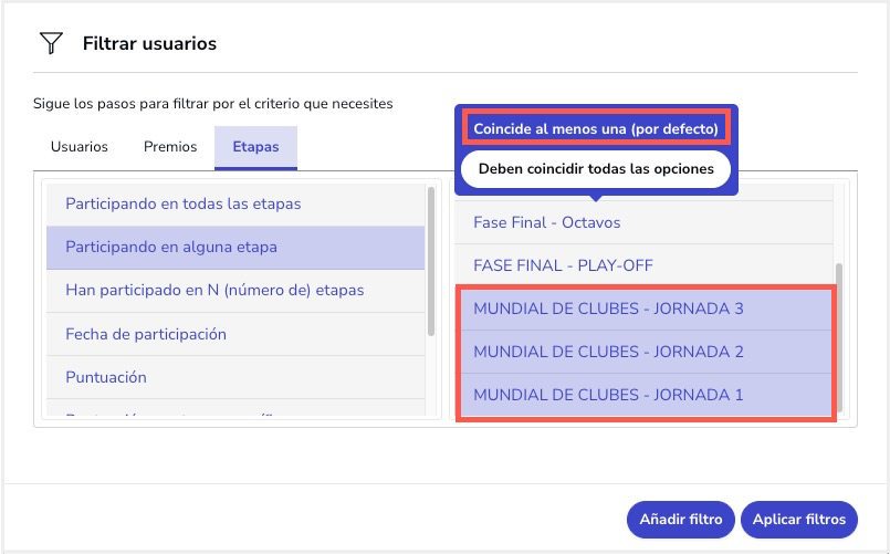 Para ello debemos de acceder al gestor de usuarios y filtrar por dos o más etapas. En este ejemplo, filtramos por las 3 primeras jornadas de una promoción creada para el Mundial de Fútbol. Además, también indicamos que al menos hayan participado en una de las etapas: